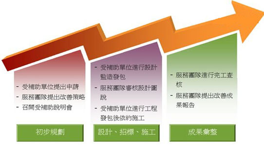 - 針對中央機關發出申請通知,再配合系統化之書面審查與分析建築物耗能原因,以初步篩選出適合改善之建築對象。